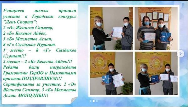Учащиеся школы приняли участие в Городском конкурсе "День Спорта": 2Ә Женисов Санжар, 2Б Бекенов Айбек, 3Б Махметов Аслан, 8Г Сыздыков Нуршат.
