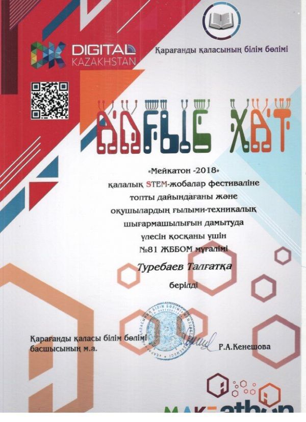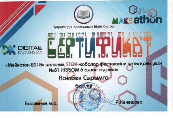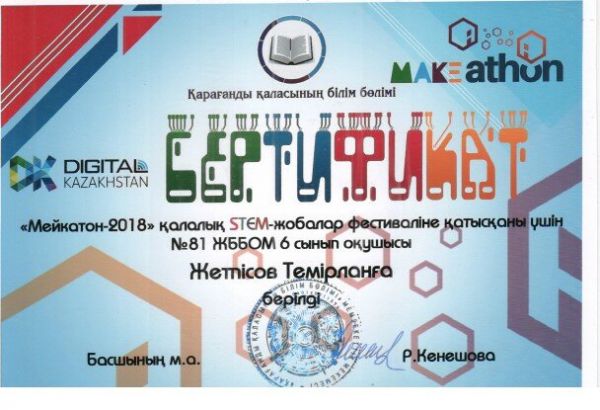 24 декабря 2018 года отдел образования города Караганды совместно с КГУ «Гимназия №39 имени М.Жумабаева» провел городской фестиваль STEM-проектов «Мейкатон-2018». В фест…