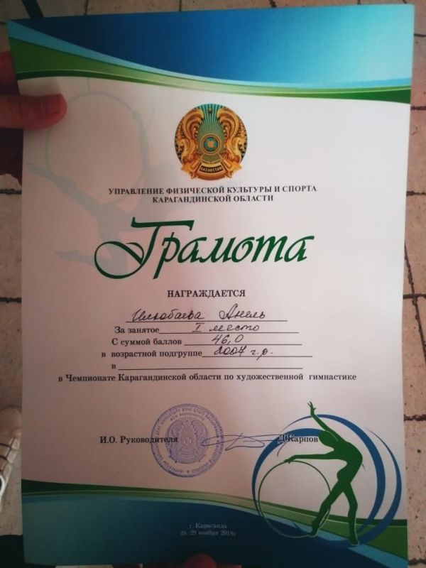 Қарағанды облысы Чемпионатында көркем гимнастикадан 1 орын алғаны үшін 6 Б сынып оқушысы Илюбаева Анельды құттықтаймыз!