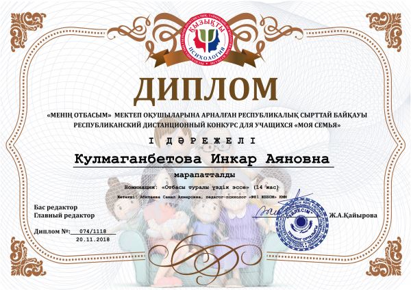 "Қызықты психология"республикалық ғылыми-практикалық журналы. "Менің отбасым" республикалық қашықтық конкурсы. 9Ә сынып оқушысы Құлмағанбетова Инкарды байқауға қатысқаны үшін құт…