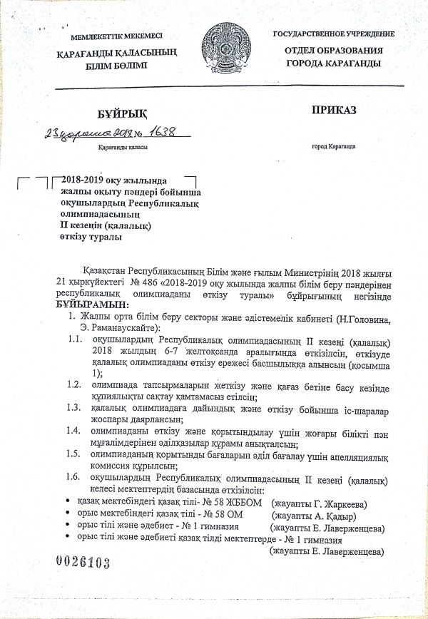 "Қарағанды қаласының білім бөлімі" ММ 23.11.2018 ж. №1638 бұйрығы негізінде "№81 ЖББОМ" КММ базасында 6-7 желтоқсан күндері математика және физика пәндері бойынша Республикалық о…
