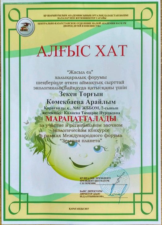Мектебіміздің оқушылары Халықаралық "Жасыл әлем" атты аймақтық экологиялық конкурсқа белсене қатысқаны үшін құттықтаймыз.