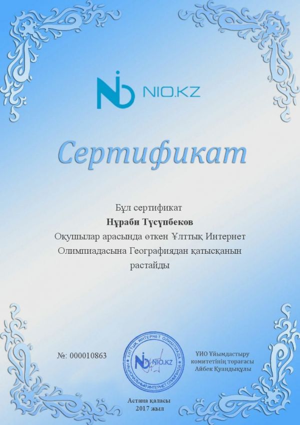 География пәніне НИО Республикалық олимпиадасына белсене қатысқаны үшін Нураби Тусупбековты құттықтаймыз!