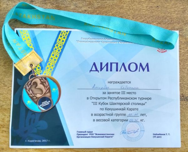 Поздравляем Амирбека Елболсына за занятое III место в Открытом Республиканском турнире "III Кубок Шахтерской столицы" по Кекушинкай Карате в возрастной группе 10-11 лет.