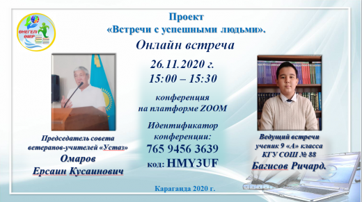 26 қарашада «Өнегелі өмір» жобасы аясында оқушылар онлайн-форматта «Ұстаз» ардагер ұстаздар кеңесінің төрағасы - Ерсайын Құсайынұлы Омаровпен кездесті. Кезедесуін…