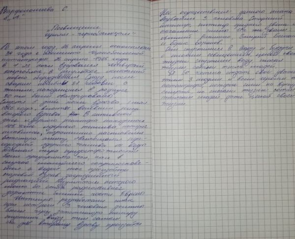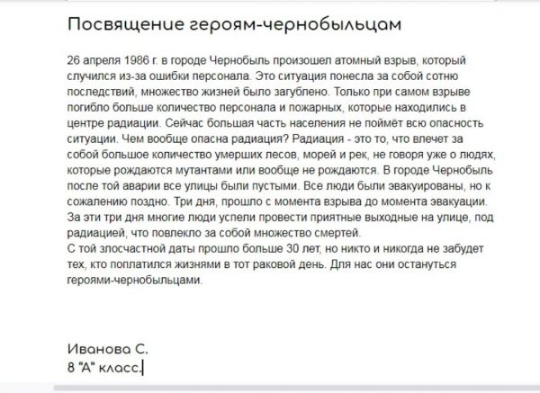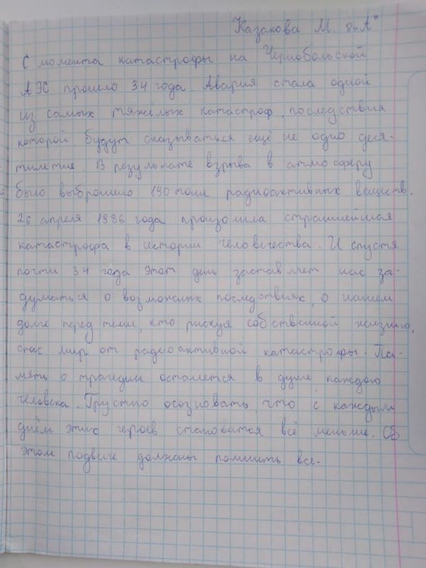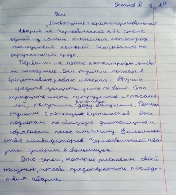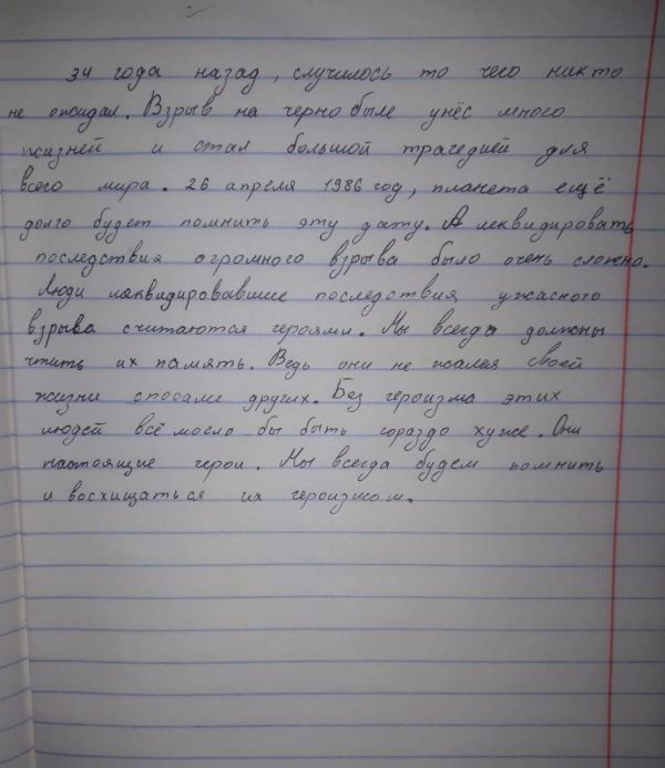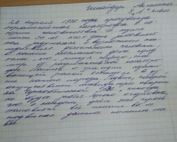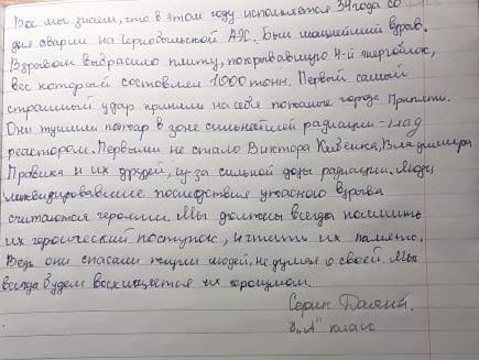 24.04.2010 ж. 7-11 сыныптарда Чернобыль апатының 34-жылдығына арналған сынып сағаттары өтті. Балалар тақырыптық презентацияларды, бейнероликтерді талқылады, эссе жазды.