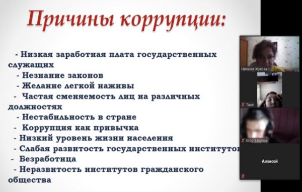 В 9 классе был проведён классный час по профилактике коррупционных действий, учащиеся приняли участие в дискуссии "Причины коррупционных действий", высказывали свои позиции по теме, спорил…