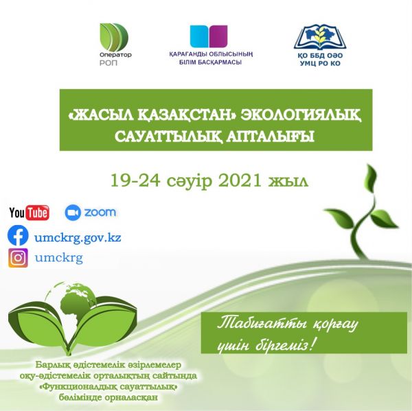 Қарағанды облысының білім беру ұйымдарында 2021 жылдың 19-23 сәуірі аралығында «Жасыл Қазақстан» экологиялық сауаттылық апталығын өткізу жоспарланды.