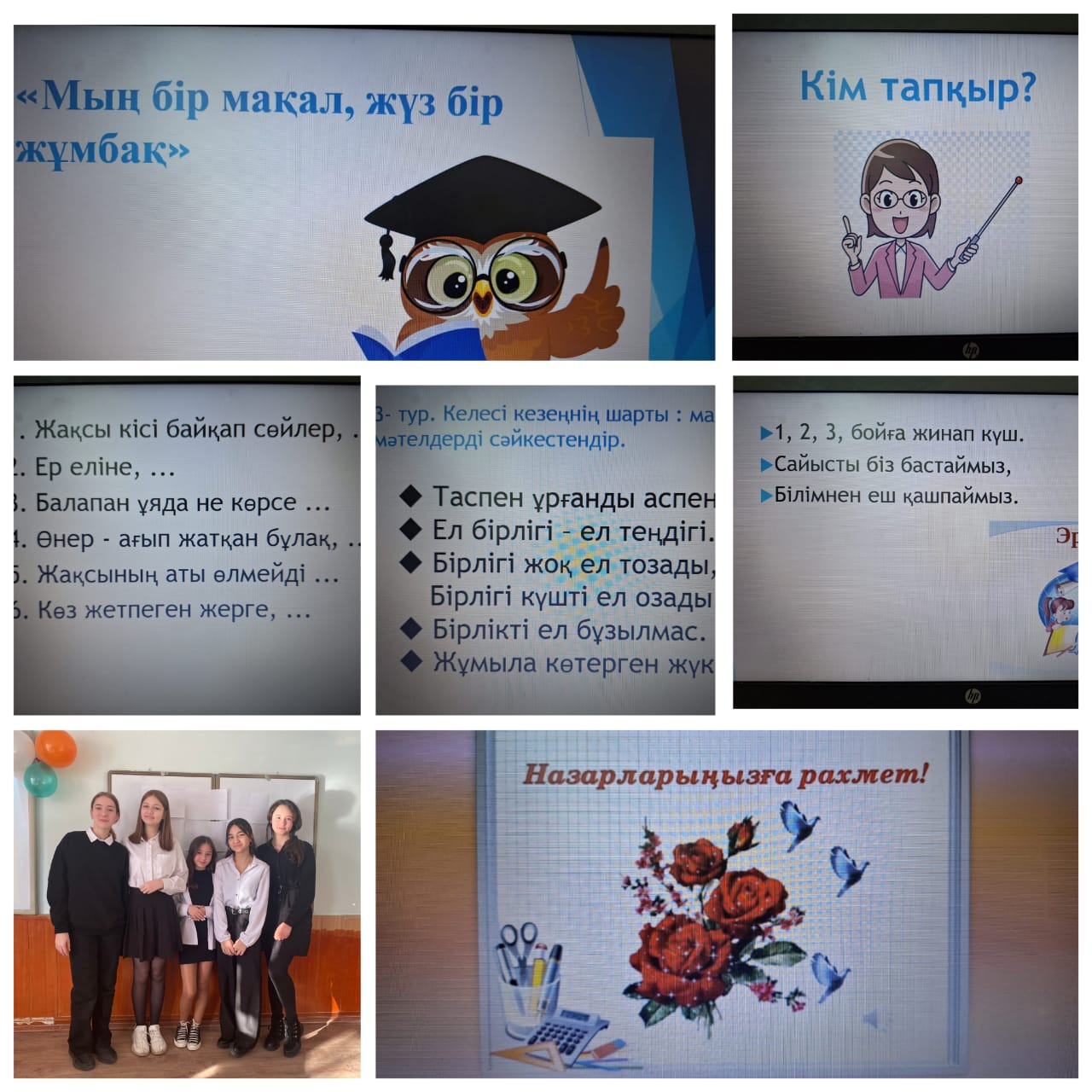 «ХХІ ғасыр- сауатты ұрпақ ғасыры» оқу сауаттылығы апталығының 3-і күні. «Оқу сауаттылығы және заманауи қоғам» аясында 7 сыныптар арасында «Мың бір мақал,жүз…