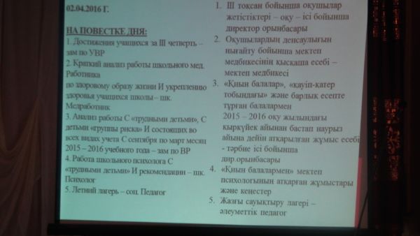 02.04 числа, в 15.00 в школе было проведено общешкольное родительское собрание об итогах ІІІ четверти текущего учебного года и отчете по работе с «трудными детьми», состоящих на уч…