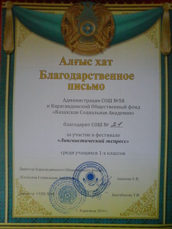 11 февраля 2014г вышла статья в газете Индустриальная Караганда "Здесь мой дом".Эта статья о том, что в ОШ №21 прошло много встреч выстовок, бесед, игр, дискуссий, посвящённых истории горо…
