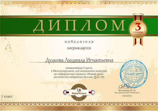 Учитель информатики Жарылгасова Мархаббат Жумабековна приняла участие в Международном дистанционном конкурсе по информатике проекта "Новый урок" и заняла І-место и была награждена свидетел…