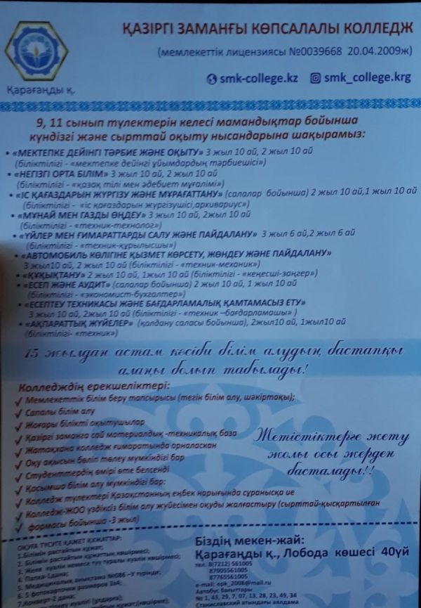 29.10.2019 ж. Мектебіміздің 9шы сынып оқушылары Қарағанды қаласының 《Қазіргі заманғы көпсалалы колледжіне》барып,мамандықтармен танысып қайтты. Оқушылар өздеріне керекті ақ…
