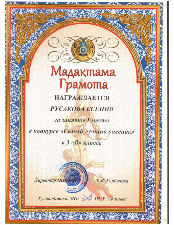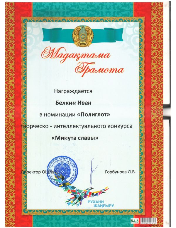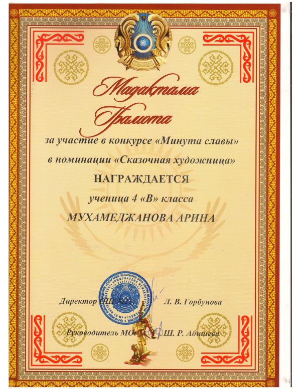 Ғылыми-техникалық бағыттағы зерттеу, жобалау және шығармашылық жұмыстардың республикалық байқауына белсене қатысқаны үшін 8 "А" сынып оқушысы Саулегулов Рамазан мен 9 "А" сынып о…