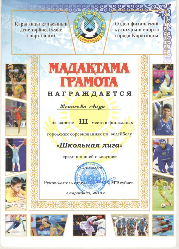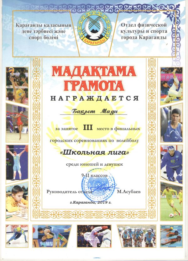 Волейбол бойынша қалалық ақтық жарыста 9-11 сыныптар арасында ІІІ орынға ие болғандары үшін Амантева Алтынтөре, Бақыт Мәди, Иманқұлов Әділет, Қасым Айбар, Қабдысалям Ақмарал, Мамараева Амина, Райымб…