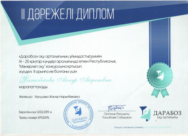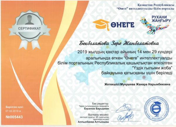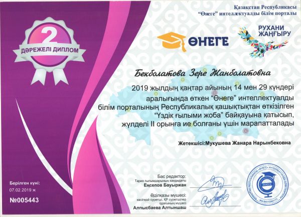 «Өнеге» интеллектуалды білім порталының Республикалық қашықтықтан өткізілген түрлі жобаларға қатысып, жүлделі ІІ дәрежелі диломмен Бекболатова Зере, Жақаева Медина, ІІІ дәрежелі диломмен…