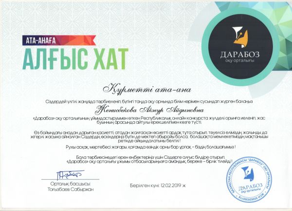 «Дарабоз» оқу орталығының ұйымдастыруымен өткен Республикалық конкурсына қатысып, жүлделі орындарға ие болғандары үшін 4 «Б» сынып оқушылары Жаңатай Жәңгір І дәрежелі, Женісб…