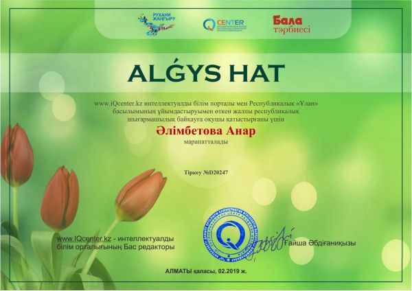 www.IQcenter.kz интеллектуалды білім порталы мен Республикалық «Ұлан» басылымының ұйымдастыруымен өткен жалпы республикалық шығармашылық байқауға қатысып «My working day» атт…