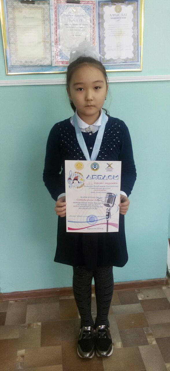 Қазақстан Республикасы Тәуелсіздігінің 25 жылдығына арналған «ӘСЕМ ӘНІМ» ашық вокал байқауында 2 «В» сынып оқушысы Сатыбалдина Ақерке дипломме…