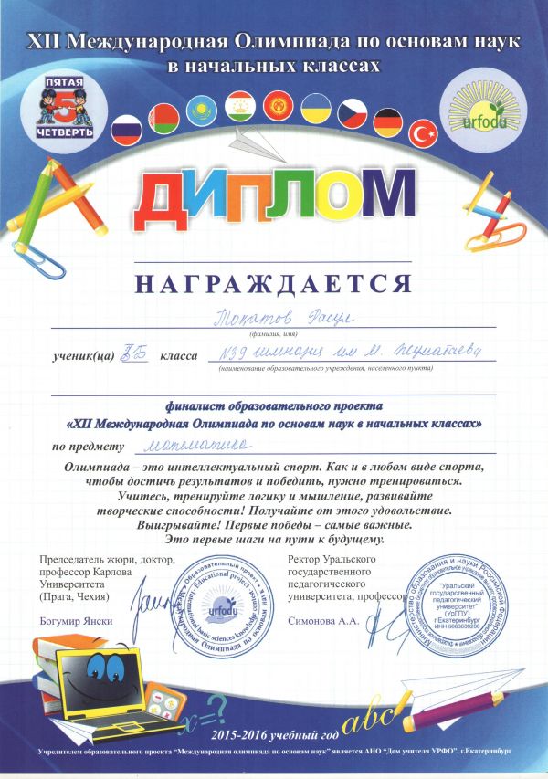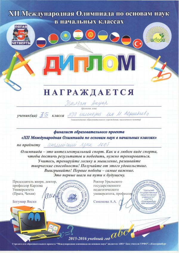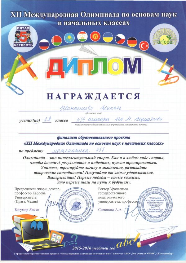 Бастауыш сыныптағы ғылым негіздері бойынша XII Халықаралық онлайн олимпиадаға қатысып, жоғары ұпай жинап, білім беру жобасының финалисті болғандары үшін Мағжан Жұмабаев ат…