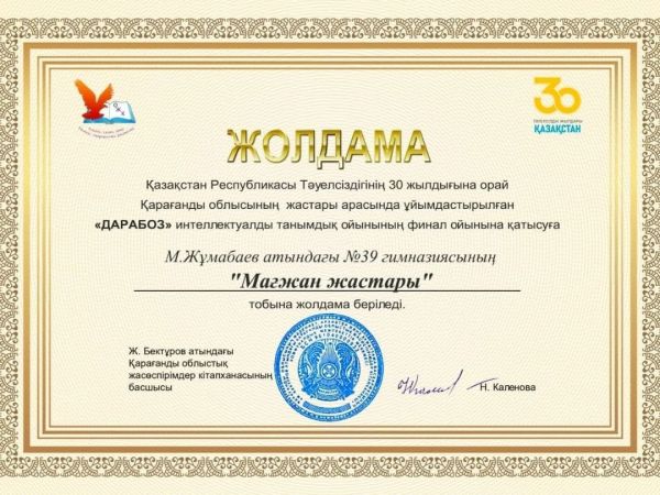 Қазақстан Республикасы Тәуелсіздігінің 30 жылдығына орай Қарағанды облысының жастары арасында құрылтайшы Қарағанды облысының мәдениет, архивтер және құжаттама басқармасы мен Ж.Бектұров атындағы Қара…