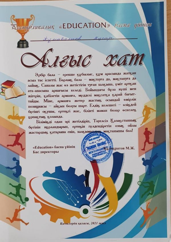 Жасампаз Қазақ елінің атын асқақтатуды көздейтін жастардың жетістіктері жарияланған Республикалық жинаққа біздің гимназиямыздың мақтанышы, 9 "б" сынып оқушысы Жумагалиев Аңсар енді. Аңсарды, ұстаздар…