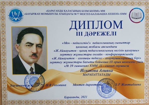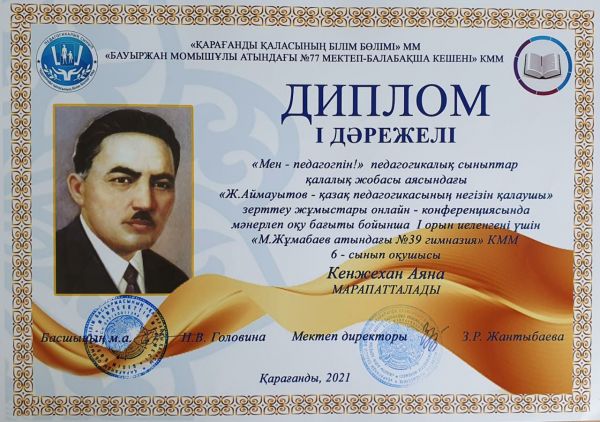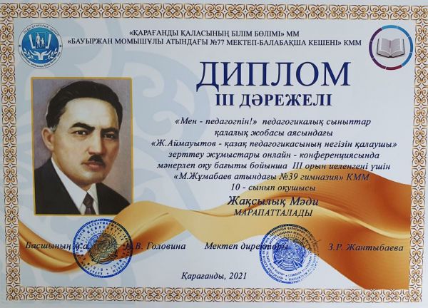 "Қарағанды қаласының білім бөлімі" ММ мен "Бауыржан Момышұлы атындағы №77 МБК" КММ ұйымдастыруымен өткен "Ж.Аймауытов - қазақ педагогикасының негізін қалаушы" атты қалалық онлайн-конференциясында 1…