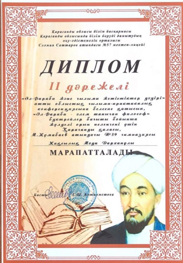 «Әл-Фараби және ғылыми жетістіктер дәуірі» атты облыстық ғылыми-практикалық конференцияның «Әл-Фараби -әлем таныған философ» бағыты бойынша