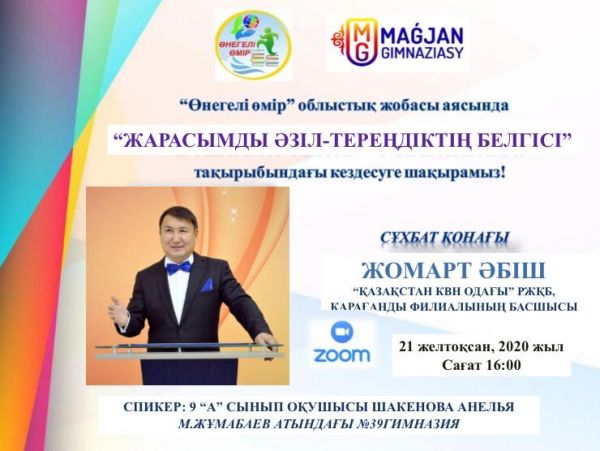 Бүгін 21.12.2020 күні гимназиямызда 7-9 сынып оқушыларының қатысуымен «Өнегелі өмір» жобасы аясында «Қазақстан КВН одағы» РЖҚБ, Қарағанды филиалының басышысы ЖОМАРТ ӘБІШ мырзамен сұхбат өткізілді. С…