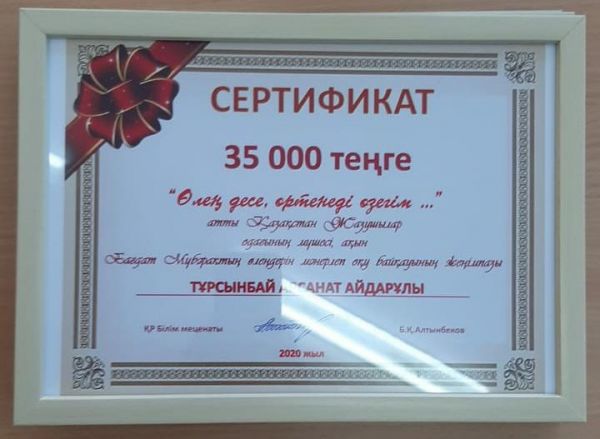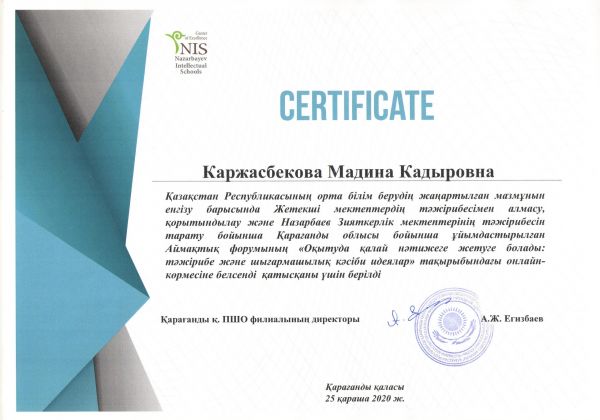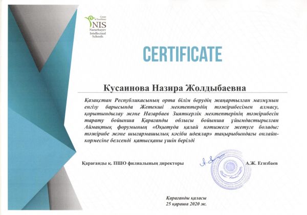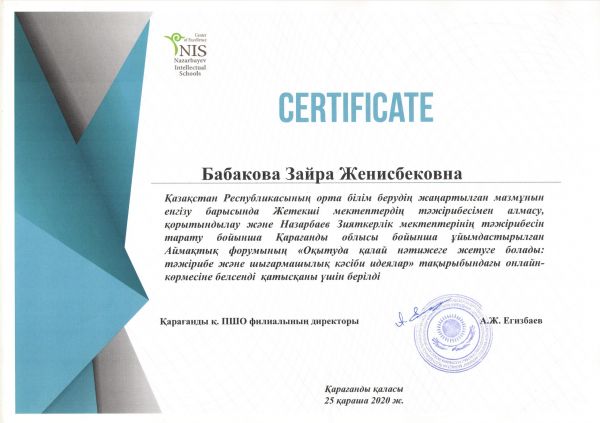 "Оқытуды қалай нәтижеге жетуге болады: тәжірибе және шығармашылық кәсіби идеялар" тақырыбындағы онлайн-көрмесіне белсенді қатысқаны үшін берілді