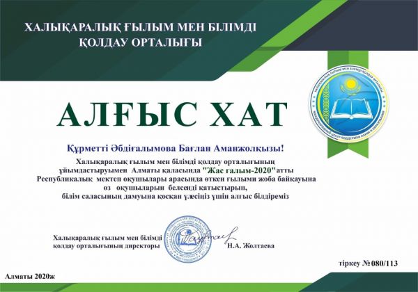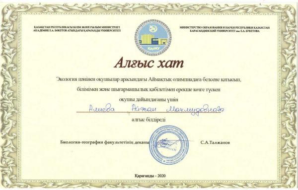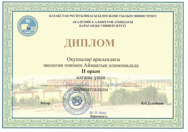 Академик Е. А. Бөкетов атындағы Қарағанды университетінің ұйымдастыруымен өткен, дәстүрлі облыстық пәндік олимпиададан гимназия оқушысы #Орынбаева_Шұғыла экология пәні бойынша қатысып ІІ дәрежелі дипл…