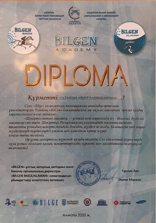 «BILGEN ALAMAN» олимпиадасында ұлттық білім сайысында 3-ші Республикалық кезеңінде l орынға Жеңіс Мансұр, II орынға Қыдыркелді Нұрай, сертификатпен Сайжанов Сагит, жетекшісі А.Р.Сатанова дипломмен мар…
