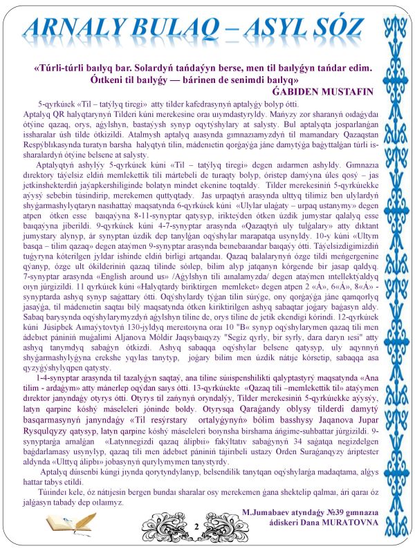 2019 жылғы 19 қазан күні М.Жұмабаев атындағы №39 гимназиясында "Рухани жаңғыру" бағдарламасы аясында "Әсемдік әлемінің құдіреті&qu…