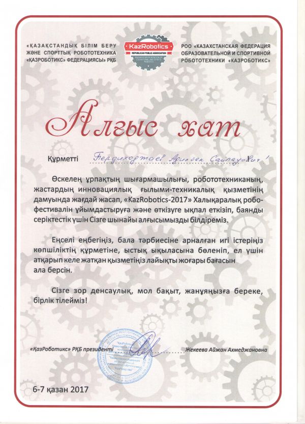 Ақтөбе қаласында 6-7 қазан аралығында өткен «KazRobotics-2017» халықаралық робо-фестивалінде белсене қатысқандары үшін Ақыжанов Адильжанға, Асетов Шахназарға сертификат бері…