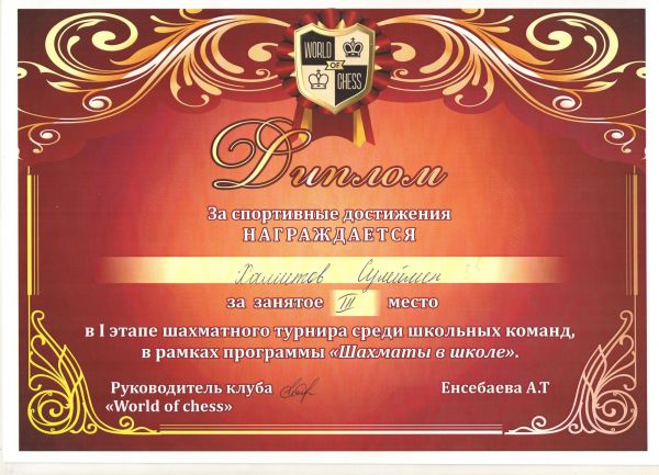 Қалалық командалық шахмат турнирінде ІІІ орынға ие болғандары үшін Бекен Айым, Мұратов Дамир, Хамитов Сүлеймен дипломмен марапатталды. Жетекшілері А.А.Мусенова.