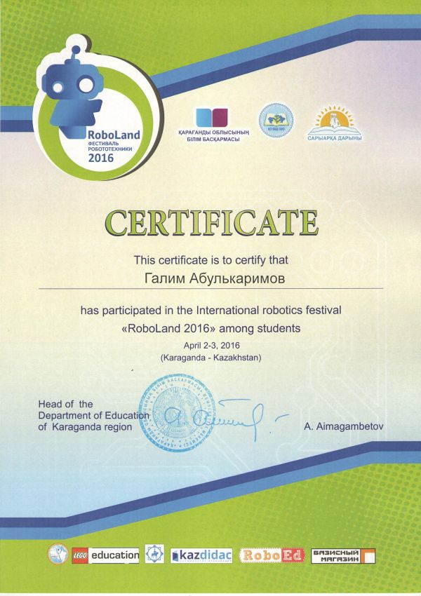 За участие 2-3 апреля в городском конкурсе по робототехнике, проведенного в целях пропаганды профессии инженера и творчества в научно-технической области, Адбулькаримову Галыму, Ак…