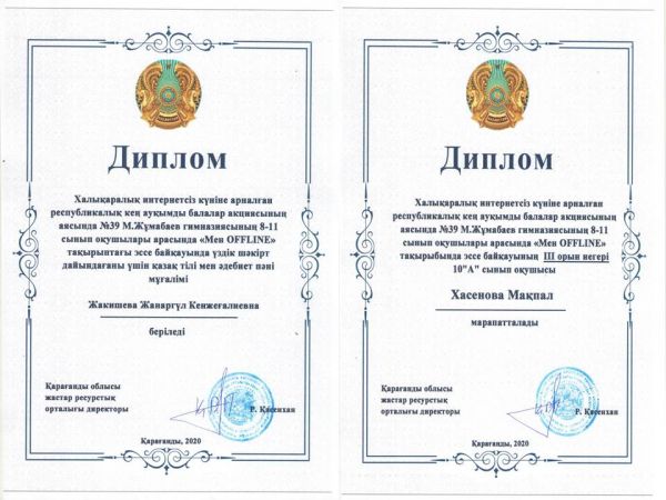 Халықаралық интернетсіз күніне арналған республикалық кең ауқымды балалар акциясының аясында «Мен OFFLINE» тақырыбында эссе байқауында І орынға 11 «Ә» сынып оқушысы Совет Тұм…