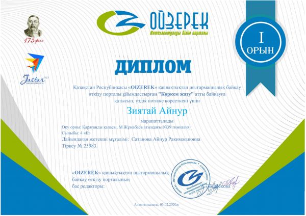 "Ойзерек" қашықтықтан шығармашылық байқау өткізу порталы ұйымдастырған "Жыр жауқазын" атты байқауға қатысып, үздік нәтиже көрсеткені үшін 4"Ә" сынып оқушылары дип…