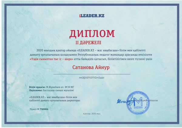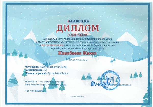 «Жасын ғұмыр -Қасым ғұмыр» атты қалалық Қасым оқуынан гимназиямыздың 8-сынып оқушысы Елемесов Алмас 2-орын алып, дипломмен марапатталды. Жарайсың, Алмас! Жетекшісі: қазақ тілі мен әде…