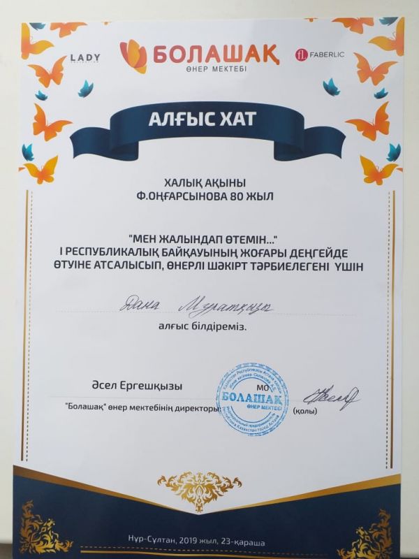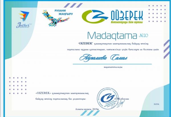 «OIZEREK» қашықтықтан шығармашылық байқау өткізу порталы ұйымдастырған «Дарынды жас» атты байқауда үздік нәтиже көрсеткені үшін 6 - сынып оқушысы Жұмажанова Айым жетекшісі Ом…