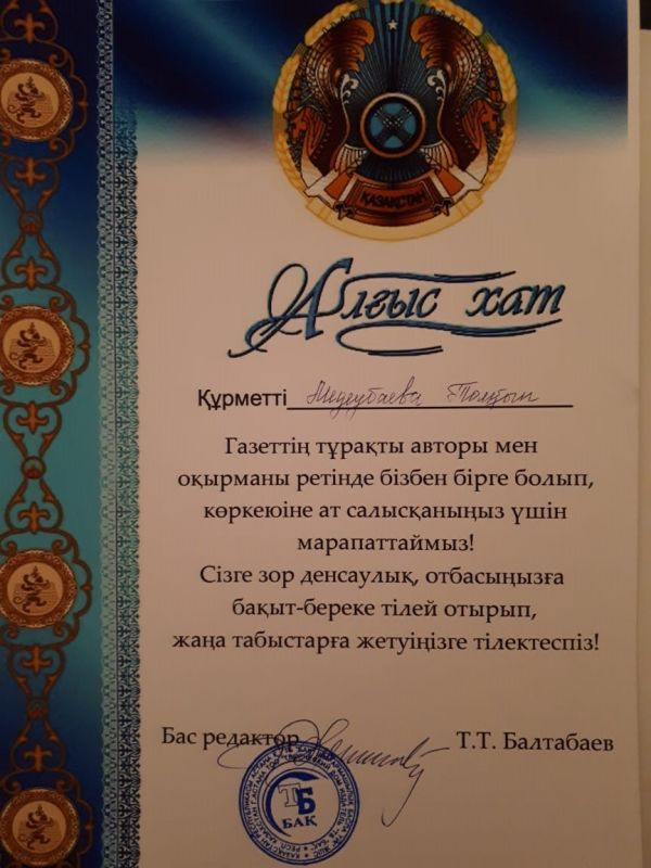 «Төртінші билік» газетінің тұрақты авторы мен оқырманы ретінде бірге болып, көркеюіне ат салысқаны үшін Медеубаева Толқын Мұратбековнаға алғыс білдірілді.