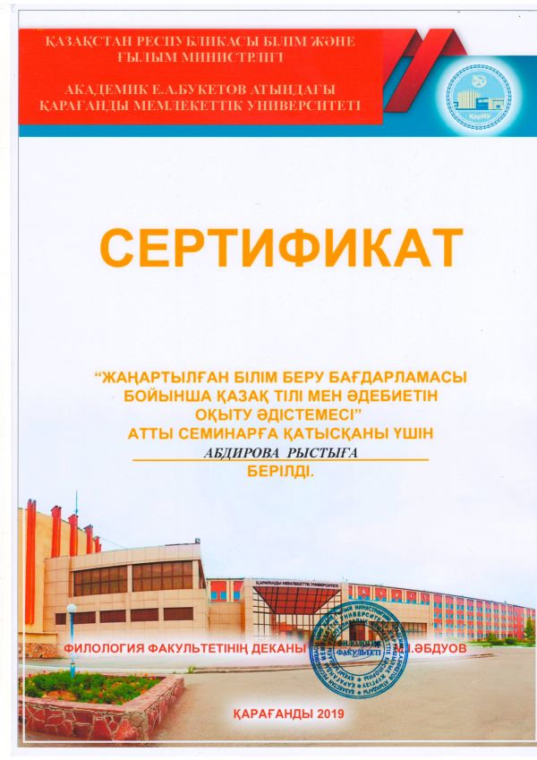«Жаңартылған білім беру бағдарламасы бойынша қазақ тілі мен әдебиетін оқыту әдістемесі» атты семинарға қатысқаны үшін Абдирова Рысты Мнажовнаға сертификат берілді.