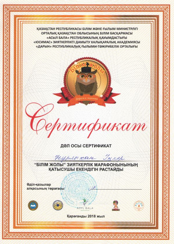 «Білім жолы» зияткерлік марафонына қатысқандары үшін Жеңіс Мансұрға, Қыдыркелді Нұрайға, Нұрлыхан Іңкәрға, Нақысбай Ерсұлтанға сертификат берілді.