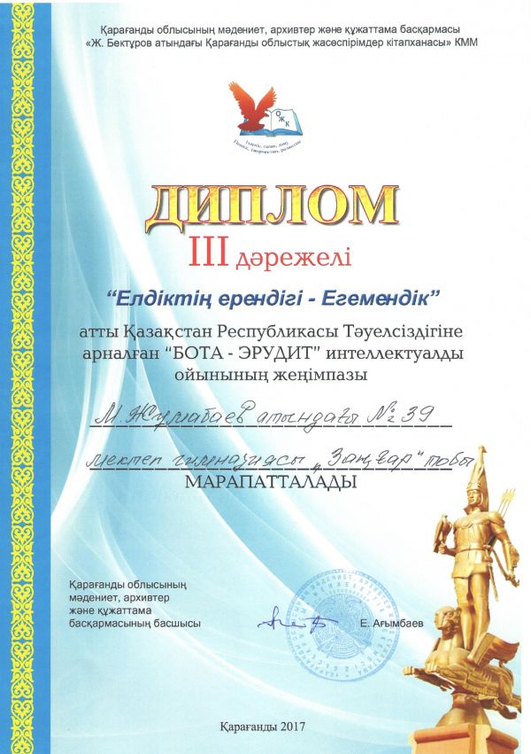 Қазақ әдебиеті пәні бойынша Республикалық қашықтық олимпиадасының жеңімпазы Қайрат Ұлжан І дәрежелі дипломмен марапатталды.Жетекшісі Өмірбаева Дана Мұратовна.