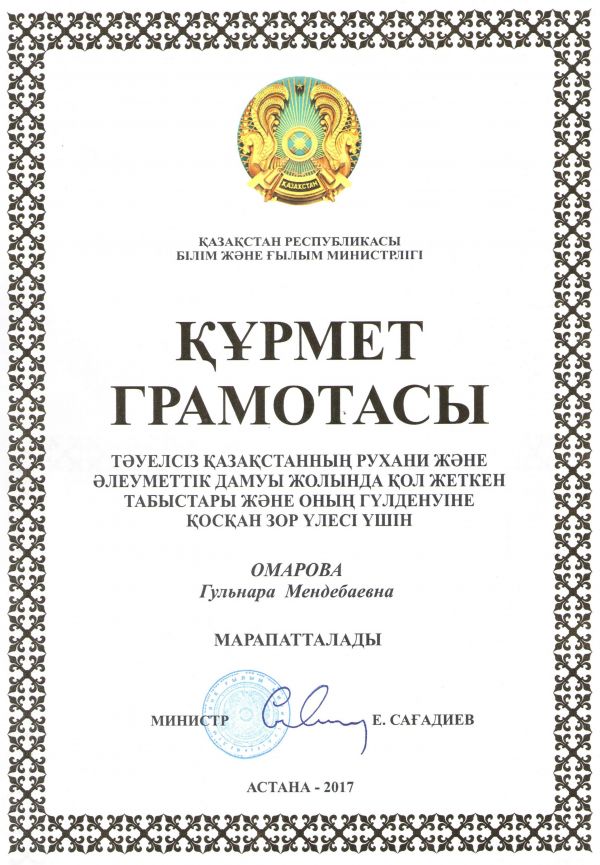 Тәуелсіз Қазақстанның рухани және әлеуметтік дамуы жолында қол жеткен табыстары және оның гүлденуіне қосқан зор үлесі үшін Омарова Гүлнара Меңдібаевна құрмет грамотасымен марапатт…