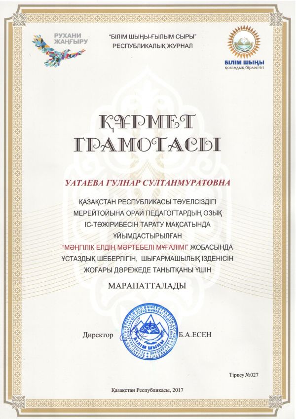 ҚР Тәуелсіздігі мерейтойына орай педагогтардың озық іс-тәжірибесін тарату мақсатында ұйымдастырылған «МӘҢГІЛІК ЕЛДІҢ МӘРТЕБЕЛІ МҰҒАЛІМІ» жобасында ұстаздық шеберлігін,…