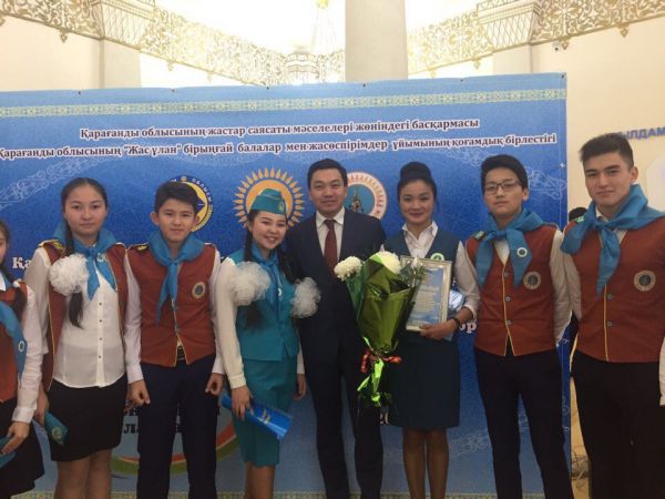 «Жас Ұлан» ұйымының 5-жылдығына орай Қазақстан Республикасындағы балалар мен жасөспірімдер қозғалысының дамуына қосқан үлесі үшін Шайхин Айдар Тұрсынбайұлына алғ…