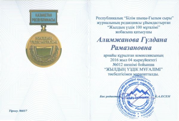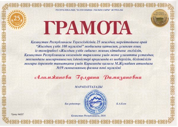 ҚР Тәуелсіздігінің 25 жылдық мерейтойына орай «Жылдың үздік 100 мұғалімі» жобасына қатысып, ұсынған озық іс-тәжірибесі «Жылдың үздік сабағы» жинақ кітабына енгізі…