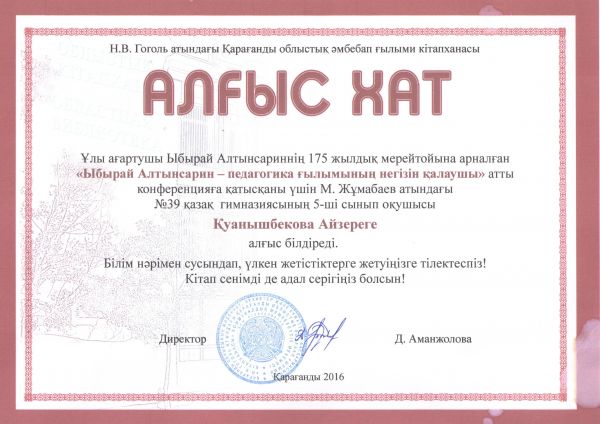 Халықаралық Интернет ресурс www.bilimnur.kz порталында ұйымдастырылған шығармашылық конкурсқа «Ең үздік баяндама» номинациясы бойынша «ИНТЕРБЕЛСЕНДІ ӘД…