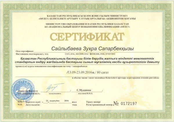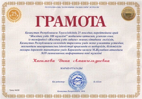 ҚР Тәуелсіздігінің 25 жылдық мерейтойына орай «Жылдың үздік 100 мұғалімі» жобасына қатысып, ұсынған озық іс-тәжірибесі «Жылдың үздік сабағы» жинақ кі…